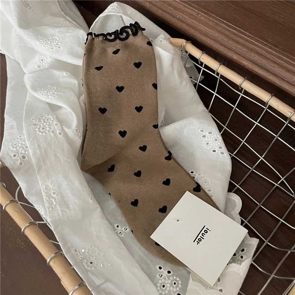 At the heart of our socks is the commitment to quality and style. Made from a cozy blend of cotton, polyester, and spandex, they offer the perfect balance of comfort and elasticity. The middle tube height is ideal for autumn and winter days, providing warmth without bulk. With a solid pattern adorned with adorable heart prints and ruffles, these socks are the epitome of cute and kawaii. Whether you're lounging at home or stepping out in style, they're designed to suit women EUR sizes 34-39, ensuring a comfortable fit for most.