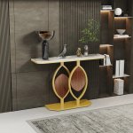 Introducing the Modern Gold Console Table with Geometric Metal Base and Sintered Stone Top, a stunning piece designed to elevate any entryway, foyer, or living room. This exquisite table combines contemporary aesthetics with practical functionality, making it a perfect addition to your modern home. Its sleek design and luxurious materials will impress your guests and enhance your interior decor.