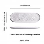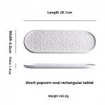 Crafted from high-quality ceramic, this plate is not only beautiful but also durable. The bead dot texture adds a subtle, tactile element to your dining experience, while the solid white color highlights the vibrant colors and intricate details of your culinary creations. With no chemicals of concern, it’s a safe and reliable choice for daily use. This plate is an ideal size for sushi rolls, appetizers, and desserts, measuring approximately 8-10 inches long, offering ample space for stylish plating.