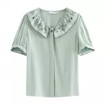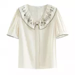 What sets our shirt apart is its seamless fusion of style and practicality. The intricate floral embroidery adds a whimsical touch, while the French lotus leaf collar exudes sophistication. Its loose fit and lightweight fabric ensure all-day comfort, making it a wardrobe staple for the modern woman.